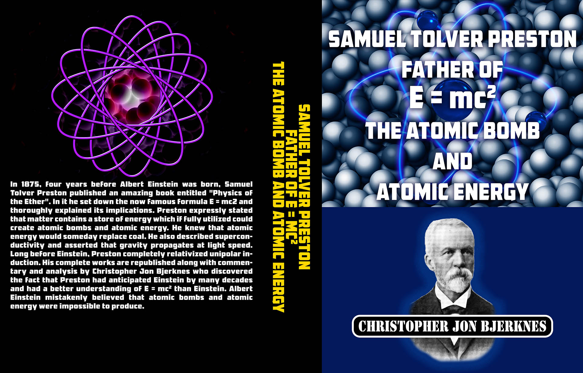 In 1875, four years before Albert Einstein was born, Samuel Tolver Preston published an amazing book entitled "Physics of the Ether". In it he set down the now famous formula E = mc2 and thoroughly explained its implications. Preston expressly stated that matter contains a store of energy which if fully utilized could create atomic bombs and generate atomic energy. He knew that atomic energy would someday replace coal. He also described superconductivity and asserted that gravity propagates at light speed. Long before Einstein, Preston completely relativized unipolar induction. His complete works on these revolutionary concepts are republished along with commentary and analysis by Christopher Jon Bjerknes who was the first historian of Physics to discover the fact that Preston had anticipated Einstein by many decades and had a better understanding of E = mc2 than Einstein. Albert Einstein mistakenly believed that atomic bombs and atomic energy were impossible to produce.